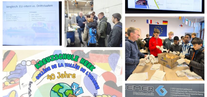 Anlässlich des 40. Jahrestages des Schengen-Abkommens erlebte die Kreuzschule Heek einen besonderen Austausch mit ihrer französischen Partnerschule. Bei Betriebsbesichtigungen in internationalen Betrieben wurde die Bedeutung des Schengen Abkommens u.a. für die berufliche Zukunft der Jugendlichen erfahrbar gemacht.