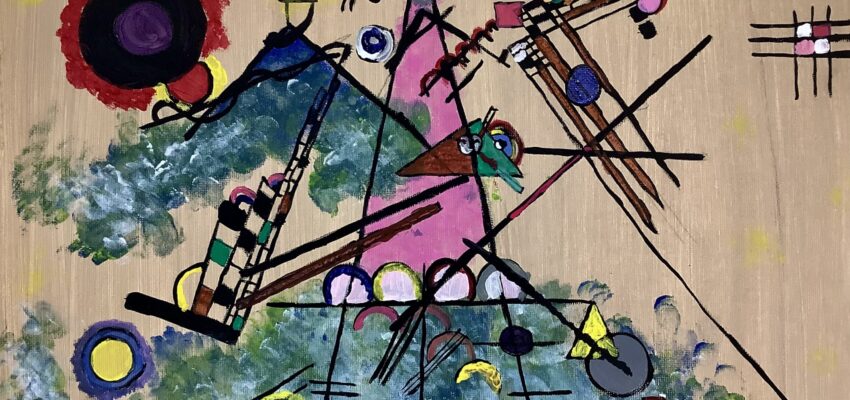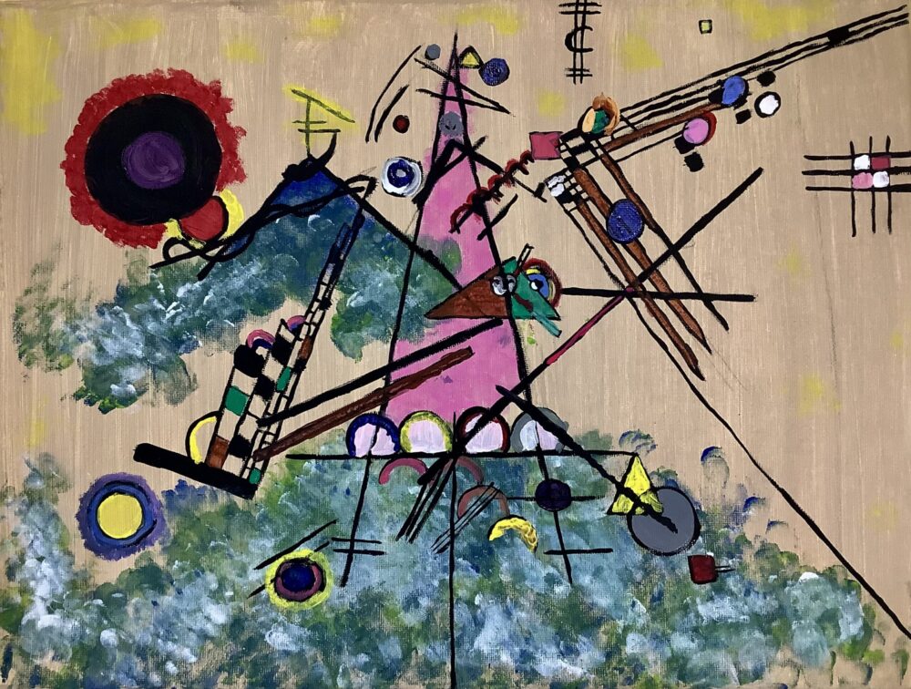 Ein ausgewähltes Bild sollte dabei den Ausgangspunkt für eine eigene künstlerische Auseinandersetzung bilden. Franziska Wisse ist dies in besonders gelungener Weise gelungen. In ihrem Werk lässt sich das berühmte Gemälde Komposition VIII aus dem Jahr 1923 von Wassily Kandinsky deutlich wiedererkennen. Gleichzeitig hat Franziska das Bild kreativ weiterentwickelt und ihm einen ganz eigenen Ausdruck verliehen.
