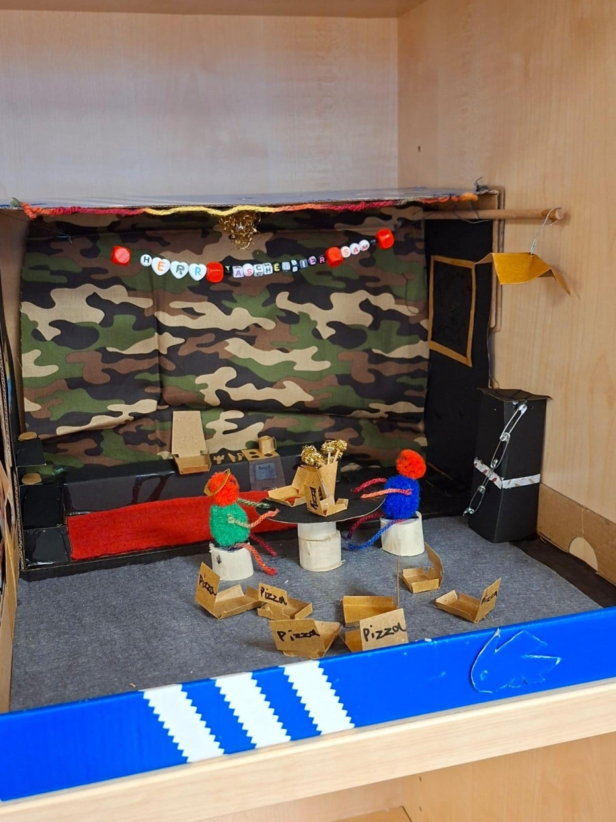 Im nächsten Schritt wurden die Schülerinnen selbst kreativ: Jeder suchte sich eine Lieblingsszene aus der Geschichte aus. Diese Szenen wurden anschließend in einem Schuhkarton als Mini-Bühne gestaltet. Mit viel Fantasie, Liebe zum Detail und handwerklichem Geschick entstanden kleine dreidimensionale Theaterwelten. Figuren wurden gebastelt, Hintergründe gestaltet und wichtige Requisiten nachgebaut.