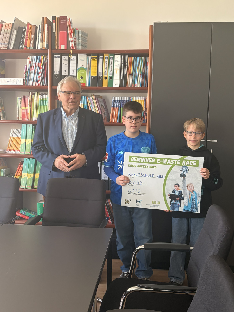 Die Klasse 5b der Kreuzschule Heek hat in diesem Jahr mit großem Engagement am E-Waste Race teilgenommen. Dies ist ein Umweltprojekt, das von der Heinz-Trox-Stiftung gemeinsam mit „Das macht Schule“ organisiert wird. Ziel des Wettbewerbs ist es, Elektroschrott zu sammeln, fachgerecht zu entsorgen und so einen wichtigen Beitrag zum Umwelt- und Ressourcenschutz zu leisten.