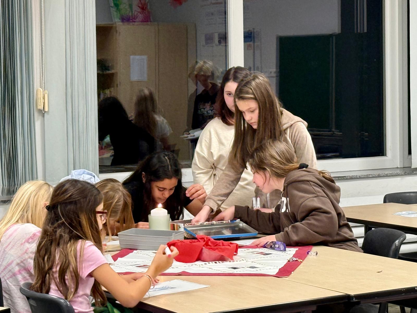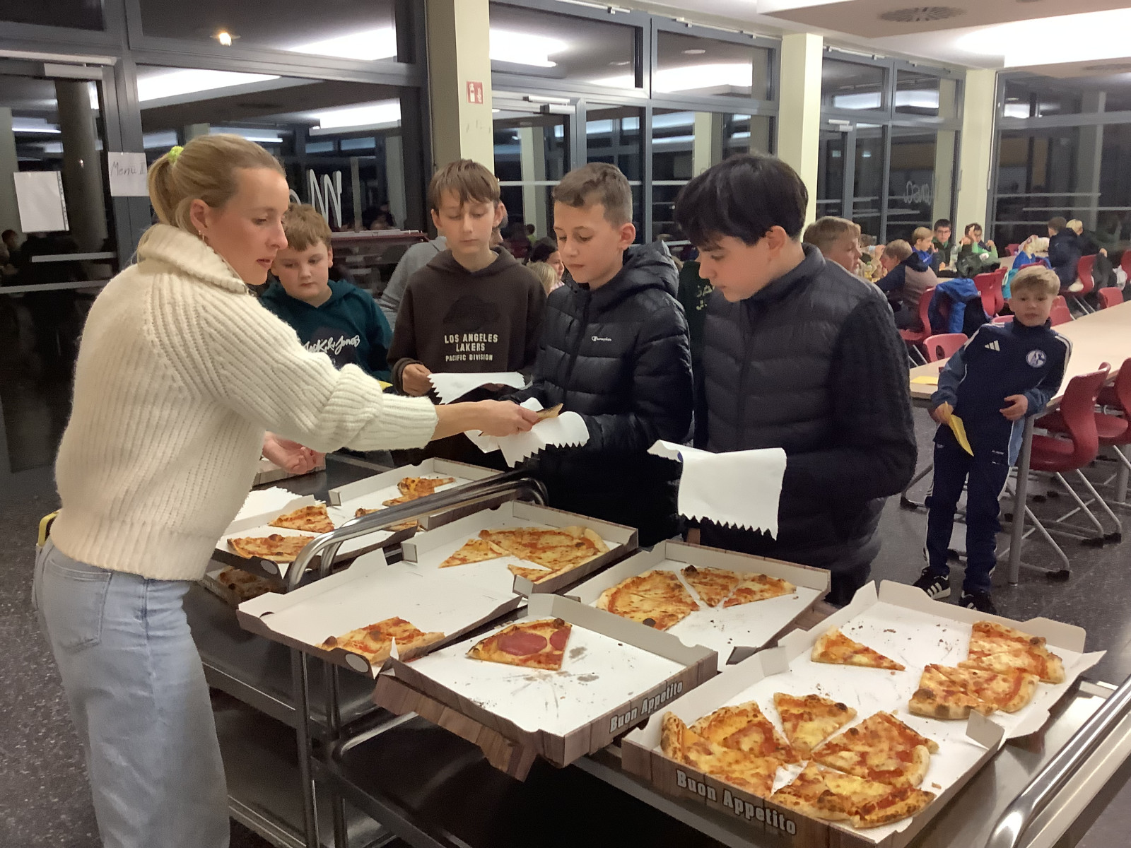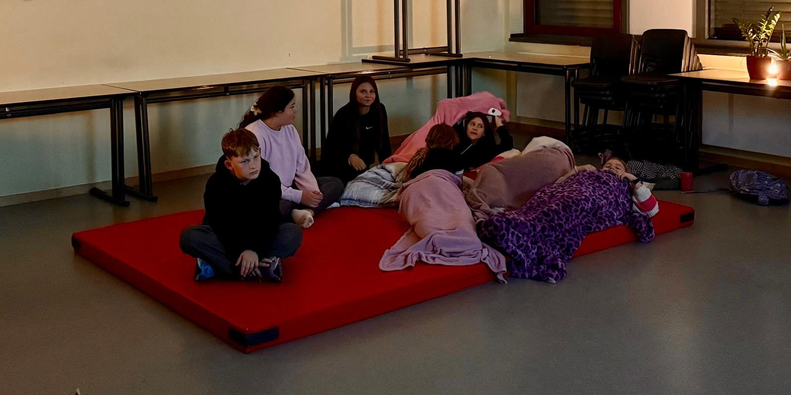 Nach einer kurzen Einstimmung startete der Abend mit einem gemeinsamen Pizzaessen – ein perfekter Beginn, um gestärkt in die bevorstehenden Abenteuer der Geschichtenwelt einzutauchen. Anschließend wurden die Schülerinnen und Schüler in Gruppen auf verschiedene Räume verteilt. Jeder Raum war liebevoll und gemütlich hergerichtet: mit Matten, warmen Licht und Platz für Lieblingskuscheltiere, die natürlich nicht fehlen durften.