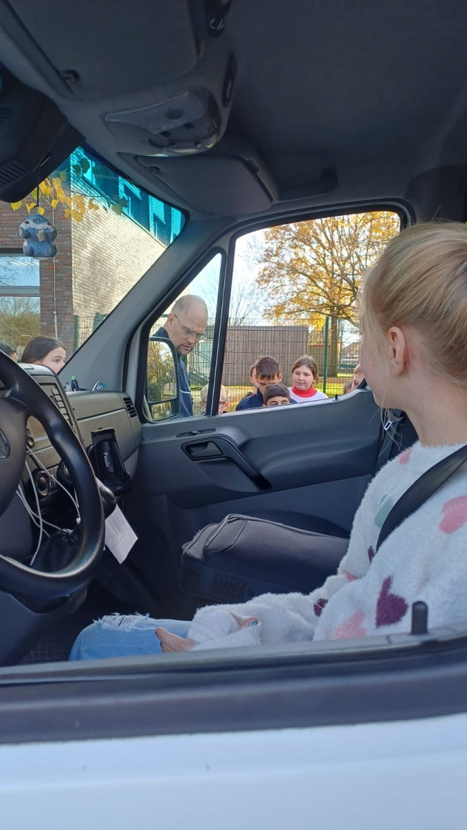In der 3. und 4. Stunde bekamen die Kinder nicht nur theoretische Hinweise, sondern konnten selbst erleben, was es bedeutet, wenn Personen im sogenannten „toten Winkel“ verschwinden: Sie durften im Führerhaus eines großen Bullis Platz nehmen und stellten überrascht fest, wie viele Menschen neben oder hinter dem Fahrzeug plötzlich nicht mehr zu sehen waren.